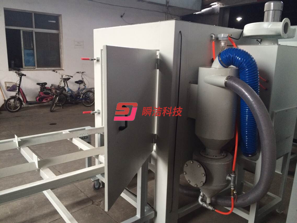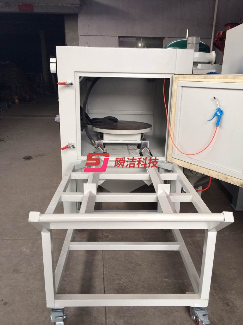 3、配備活動臺車,和轉盤,操作時將工件放在轉盤上,然后推入機內即可噴砂作業(yè),操作簡單省力。