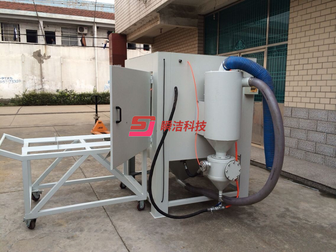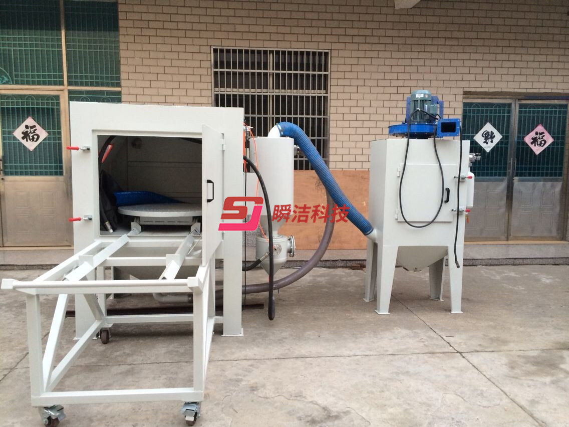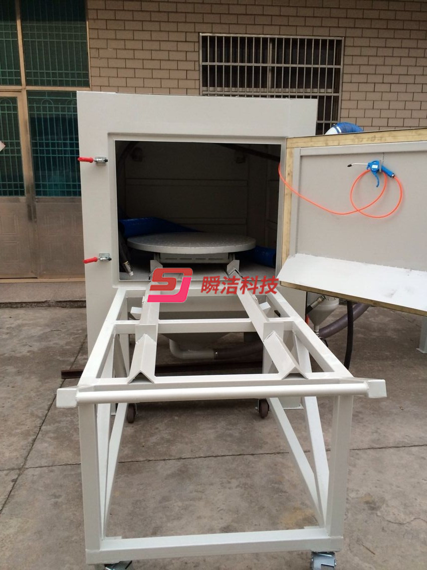 、配備活動(dòng)臺車,和轉(zhuǎn)盤,操作時(shí)將工件放在轉(zhuǎn)盤上,然后推入機(jī)內(nèi)即可噴砂作業(yè),操作簡單省力。