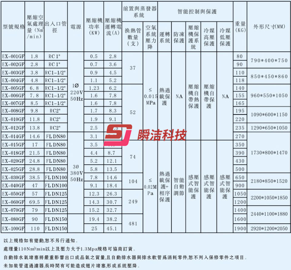 a~1.3MPa (超過1.3MPa可接受訂貨) 壓縮空氣流量:≤干燥機之銘牌標識 操作電源:參照干燥機之銘牌標識 EX風冷高溫型技術參數表